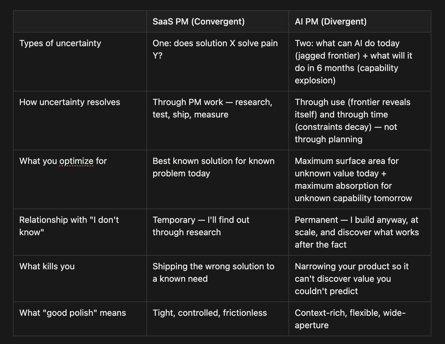 Core thesis: SaaS PM is convergent. AI PM is divergent. And convergent instincts in a divergent environment will kill your product.