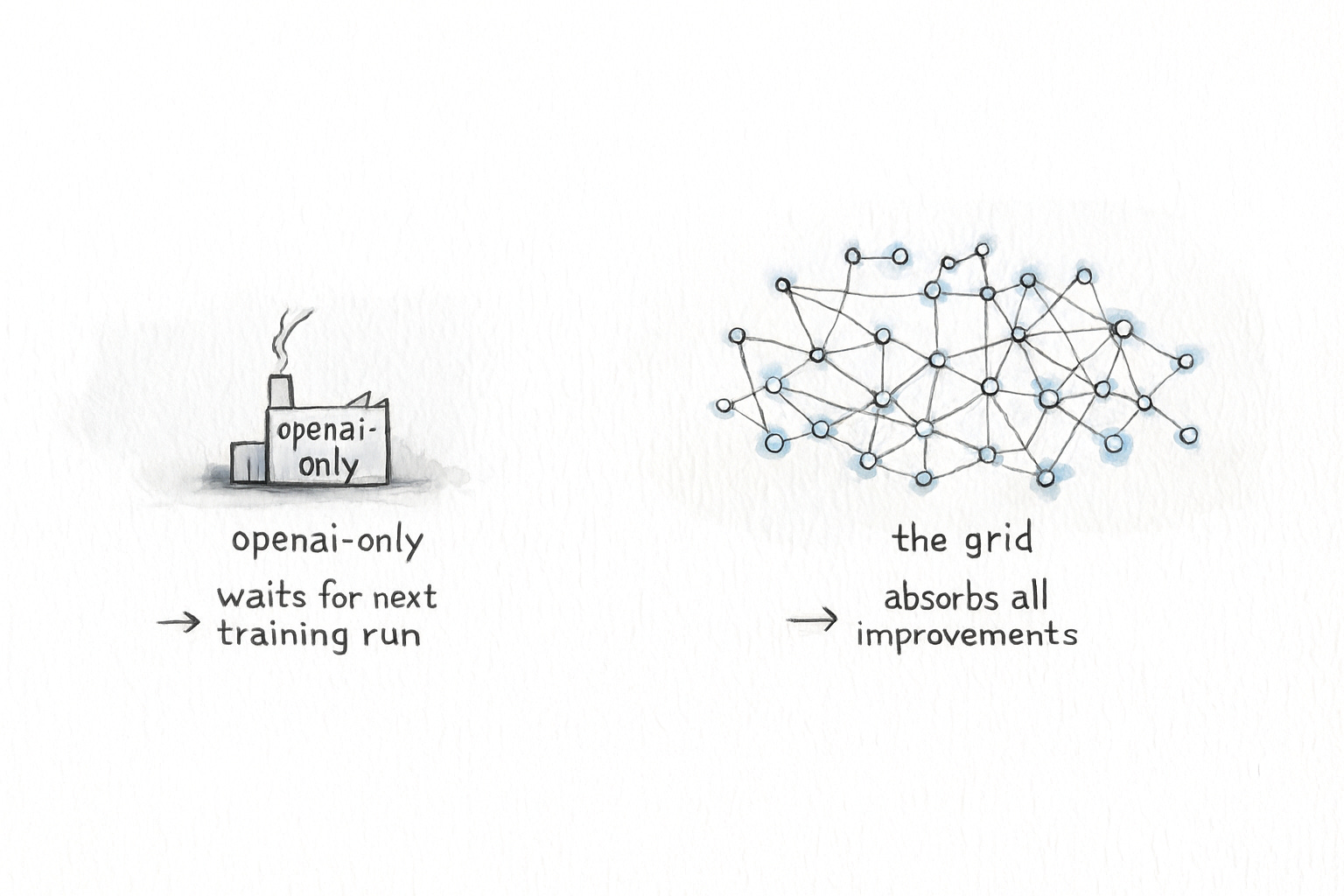 If you’re model-agnostic — if you’re a grid — you get 100% of all improvements. Every lab’s breakthroughs become your breakthroughs. The gap compounds with every release cycle.