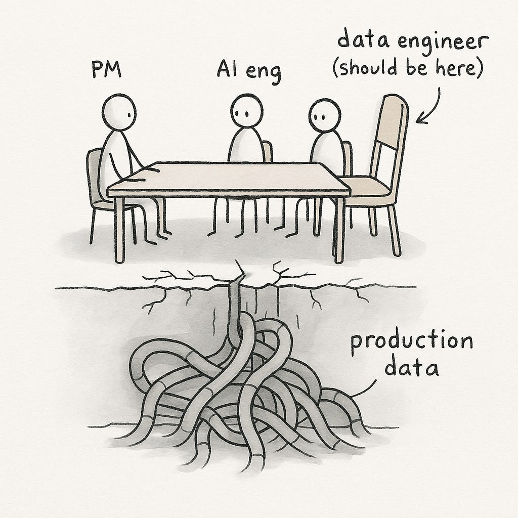 Data engineers should be at the core of your AI team. Not supporting them. Not “helping with infrastructure.” Core team members, from day one, with equal authority. The AI industry got this backwards. Your product breaks on production data that looks nothing like your test set. Deployments take down the system. Your AI team stares at throughput issues they can’t diagnose. Something’s wrong with how the industry structures these teams. Your AI product processes terabytes of novel data every week—from users, from production, from contexts your test set never imagined. And you’re handling it without experts who know how to build systems that process data at scale without breaking. This is the AI-First Trap: optimizing for what AI conferences celebrate while your product breaks on what they ignore.