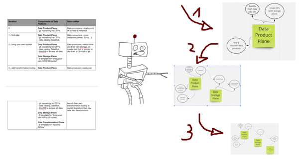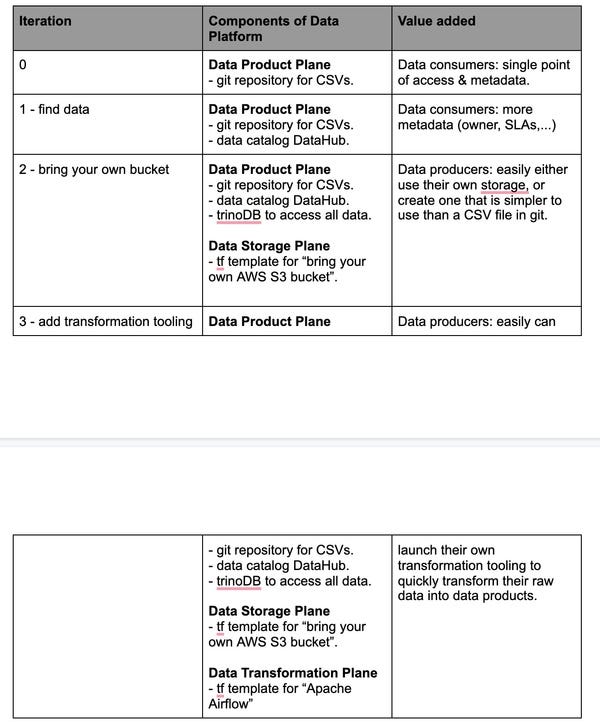 Note: But this is also the point where we probably realize that we do need a small team to maintain the self-serve platform, as we cannot ignore the SLAs that come with having a running data catalog somewhere (although using a hosted solution would put that off by a few iterations).