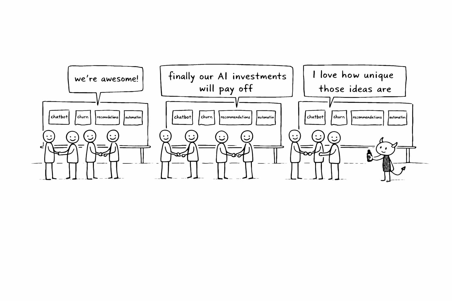 Someone senior says “we need to find AI opportunities.” You break into groups, fill whiteboards, come back with sticky notes. Chatbots. Report automation. Recommendation engines. Churn prediction.